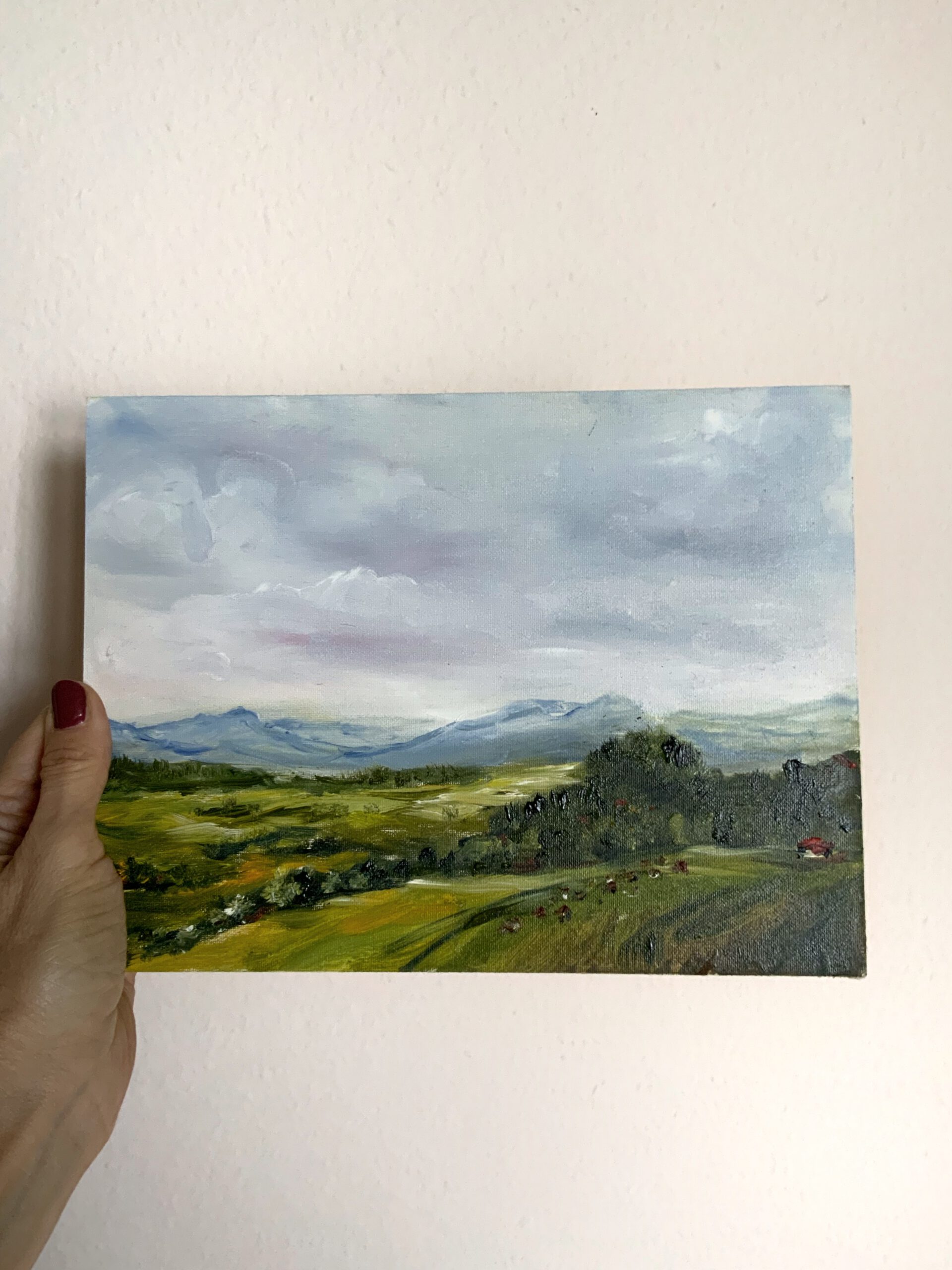 This original oil painting portrays a tranquil Alpine landscape inspired by the Swiss countryside. Soft green meadows unfold toward distant blue mountain ranges, while subtle color transitions in the sky create a feeling of openness, air, and quiet movement.