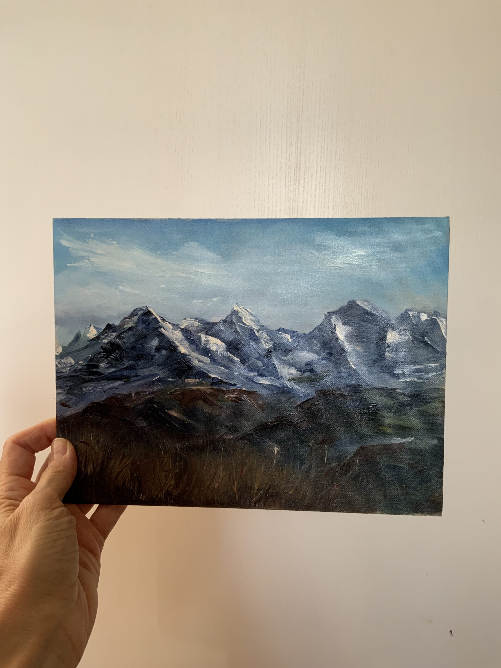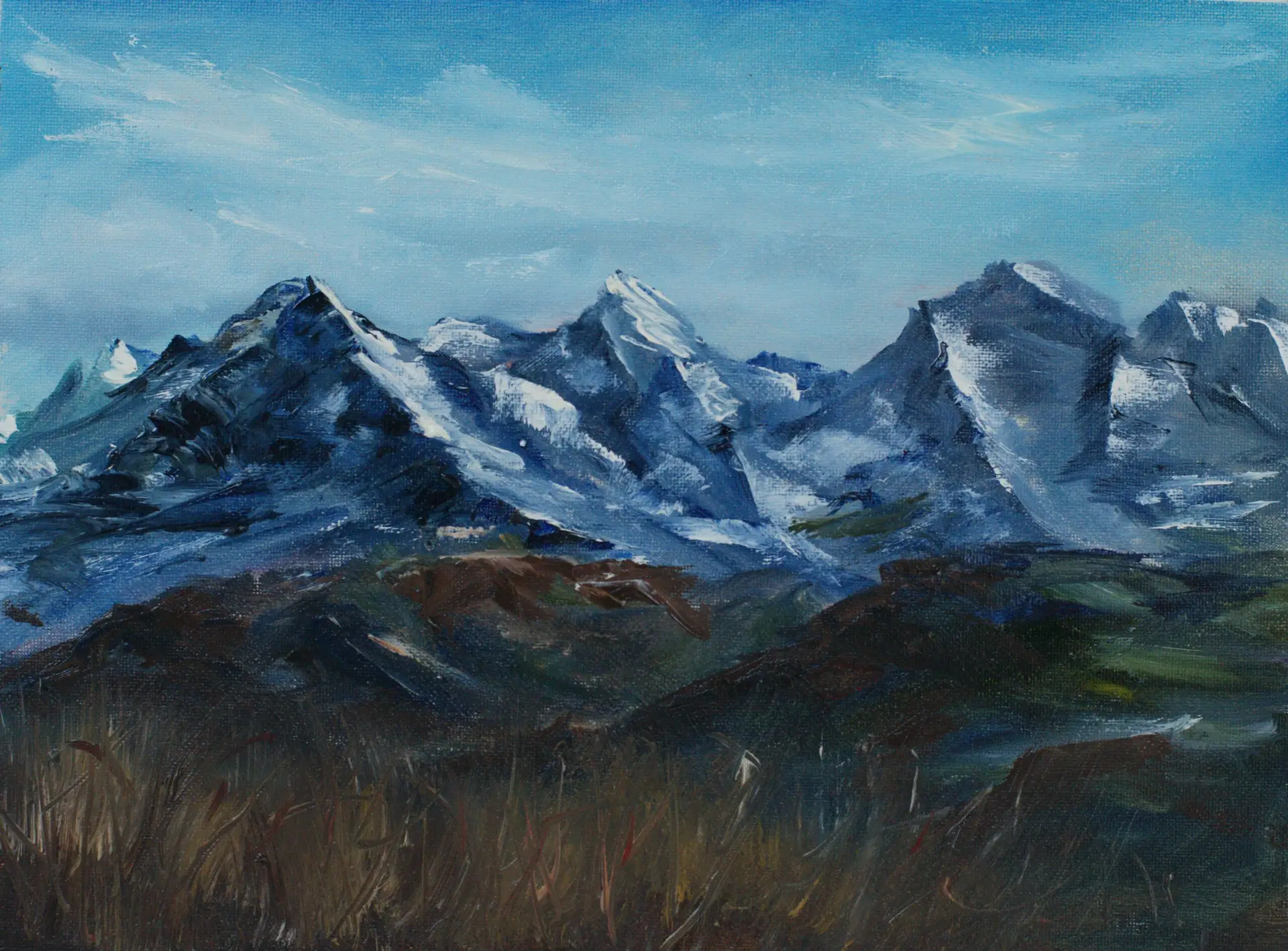 This original oil painting depicts a serene mountain landscape inspired by the Swiss Alps. Layers of deep blues, soft whites, and earthy tones create a sense of depth and movement, while expressive brushwork conveys the raw beauty and calm of high-altitude scenery.